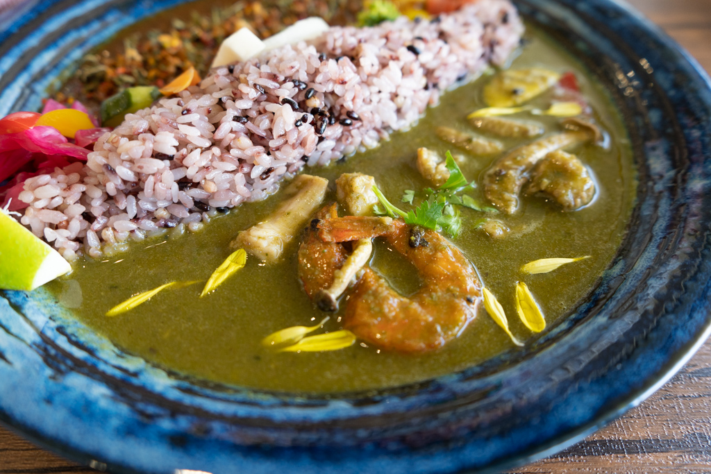 今月のあいがけはエビとホルモンのグリーンカレーなんですよ